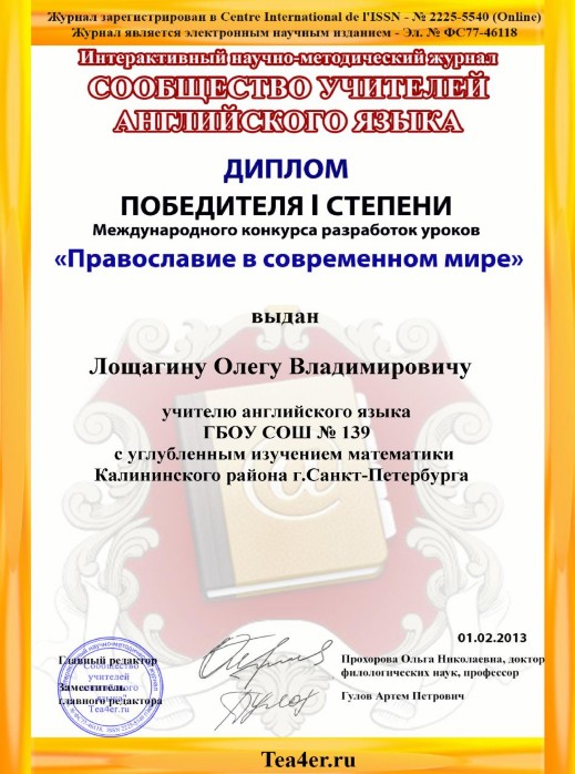 Учитель английского языка Олег Владимирович Лощагин стал абсолютным победителем международного конкурса разработок уроков "Православие в современном мире", организованного сообществом учителей английского языка Tea4er.ru